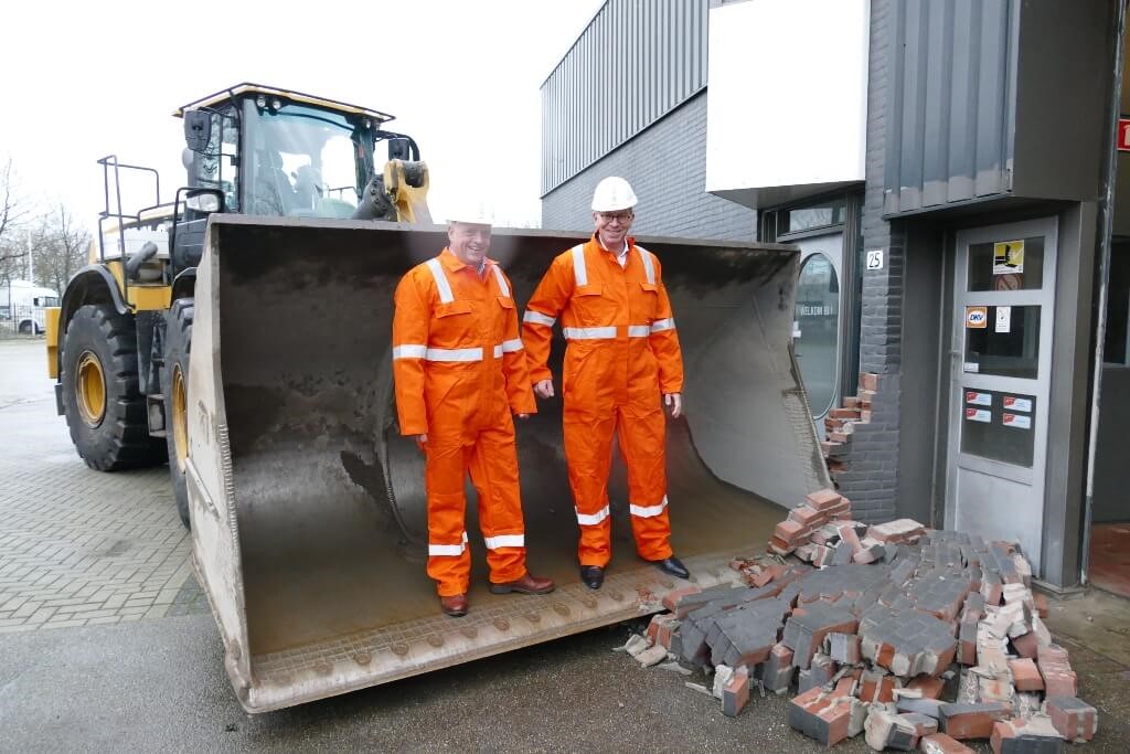 Piet und Michel Heerkens auf dem Bulldozer nach dem symbolischen Anstoß des Neubaus 2018.