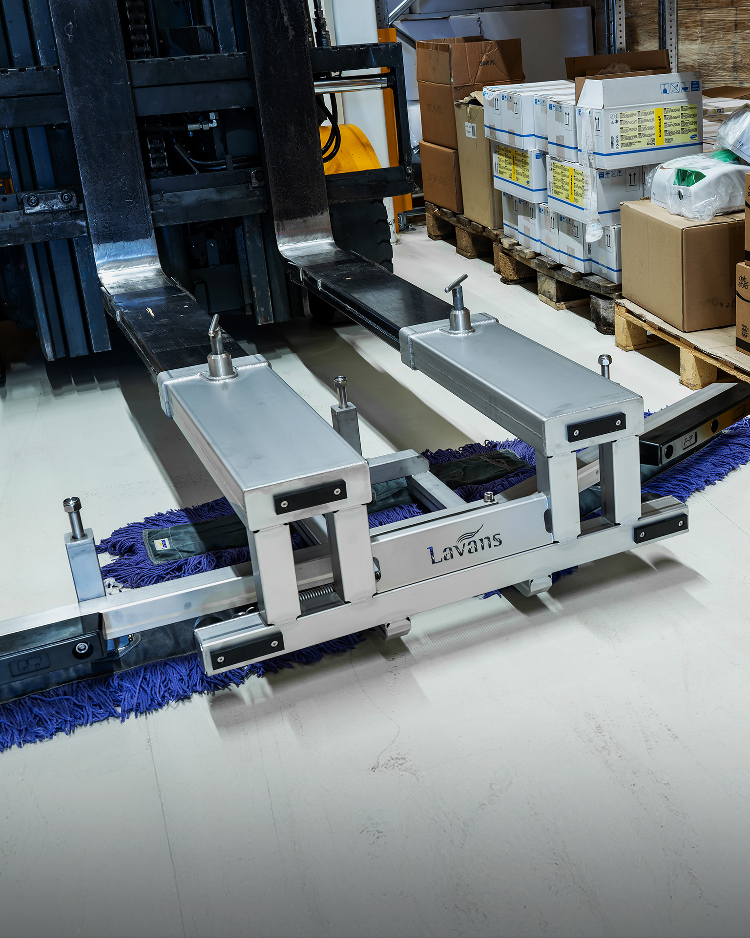 6.000 m² in einer Stunde – das schafft kein Mensch mit einem Wischer, aber Ihr Gabelstapler mit unserer cleveren Vorrichtung. Einfach aufstecken, drei Lavans-Bodenwischer à 75 cm einhängen, losfahren. Mit bis zu 2,1 Metern Arbeitsbreite verwandelt sich Ihr Stapler in eine Reinigungsmaschine, die nebenbei für Sauberkeit sorgt.